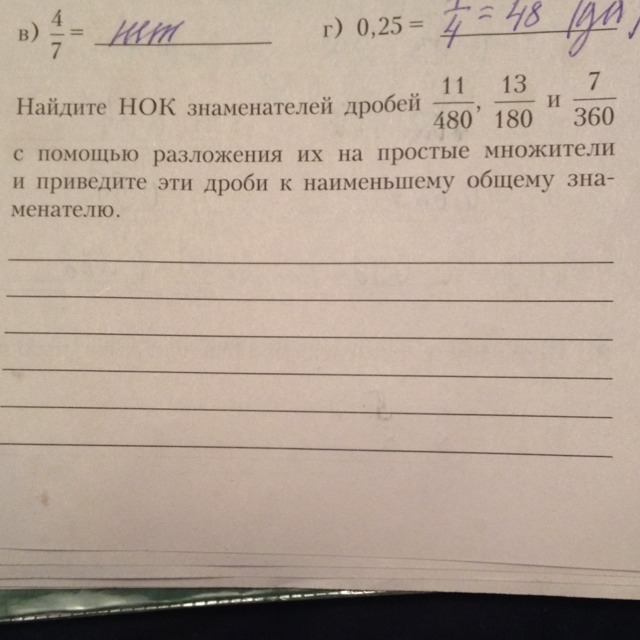 Найдите НОК (наименьшее общее кратное) дробей 11/480 , 13/180 , 7/360 с помощью разложения их на простые множители и приведите эти дроби к наименьшему общему знаменателю.