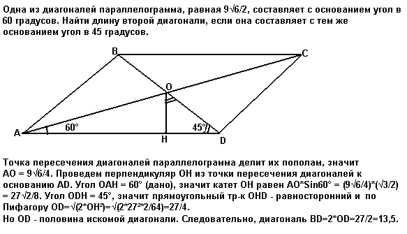 Одна из диагоналей параллелограмма, равная 9√6/2, составляет с основанием угол в 60 градусов. Найти длину второй диагонали , если она составляет с тем же основанием угол в 45 градусов.·