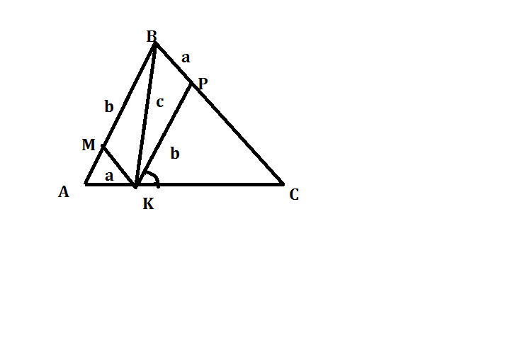 по сторонам KM=BP,KB,KP. От прямой KP откладываем известный угол в точке K и проводим полученную прямую.