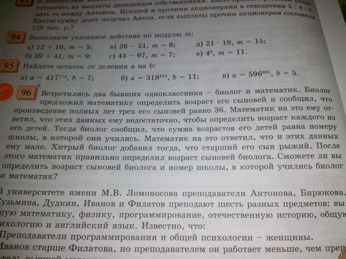 После этого математик сообщает, что данных недостаточно, а биолог говорит про сумму возрастов и номер школы.
