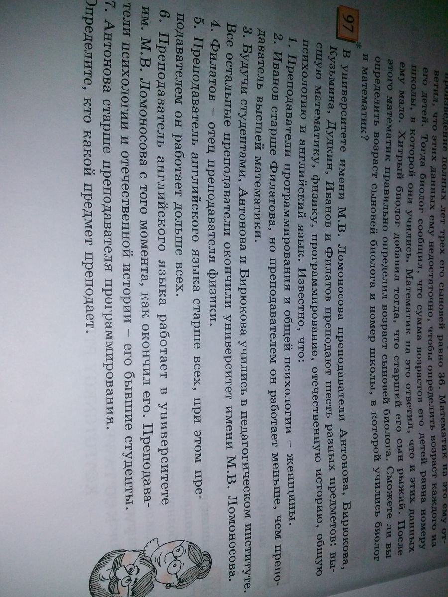 По усл.6 - преподаватель психологии закончила МГУ - это Кузьмина, т.к. Бирюкова и Антонова закончили педагогический.