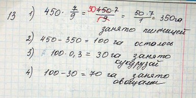 в колхозе пшеницей занято 7/9 всего поля , под кукурузой 3/10 остальной площади, оставшаяся часть отведена под овощи. сколько гектаров земли отведено подовощи, если площадь поля 450 га?