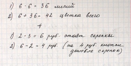 2.коробка кнопок стоит 2 рубля,а скрепка в 3 раза дороже. На сколько кнопки дешевле скрепок?