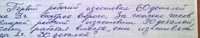 Если первый работник делает 60 деталей за 3 часа то значит за 1 час он делает 20 деталей если они вместе делают 30 деталей то значит надо 30 - 20 = 10 деталей и если второй работник делает 10 деталей за 1 час то значит 90 деталей он делает за 9 часов