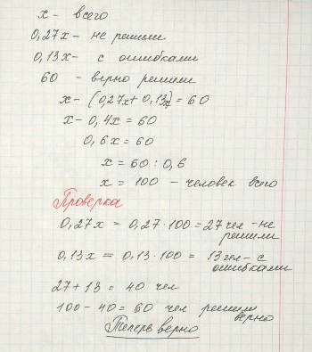 При выполнении письменной работы по математике 27% абитуриентов в аудитории вообще не решили задачи, 13% абитуриентов в аудитории решили задачи с ошибками, оставшиеся 60 человек решили задачи верно. Сколько человек было в аудитории?