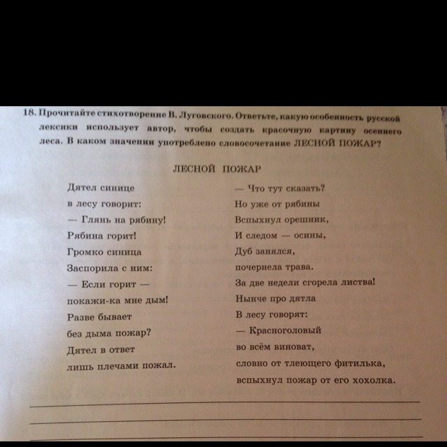 Стихотворение Луговского построено на многозначности русской лексики, которая является основой её метафоричности .Непонимание между дятлом и синицей заключается в том ,что синица воспринимает слова в прямом смысле и при упоминании пожара ищет дым .А дятел использует метафору .Горит дерево ярким цветом ,потому что покраснели осенние листья