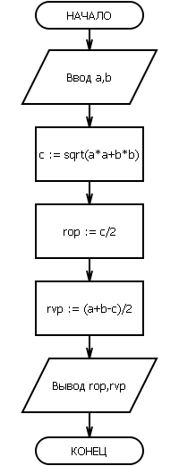 Прямоугольный треугольник задан двумя катетами и угол между ними. Вычислить радиусы вписанной и описанной окружности