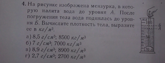 На рисунке изображена мензурка, в которую налита вода до уровня A. После погружения тела вода поднялась до уровня Б. Вычислите плотность тела, выразите её в кг/м3.