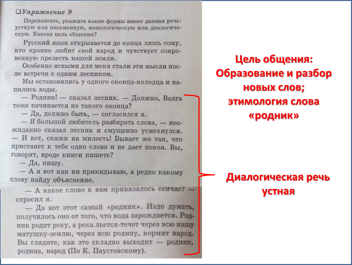 Данный текст имеет устную и диалогическую формы речи. Цель общения - определение значения слова "родник".
