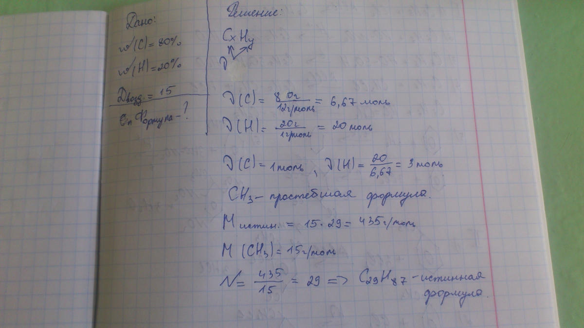 определить молекулярную формулу углеводорода имеющегося следующий состав: C - 80%, H - 20%, плотность по воздуху = 15
