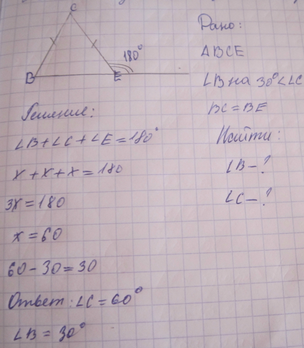 Найдите угол В в треугольнике ВСЕ если он на 30 градусов меньше угла С, а в нешний угол при вершине Е равен 180 градусов.