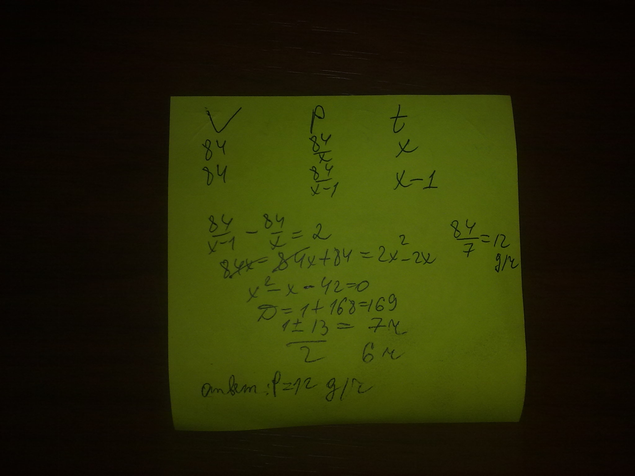 V1=V2=84,T1=x, T2=x-1, Р1=84/х, Р2=84/х-1. 84/х-1 - 84/х = 2. 84х-84х+84 = 2х2 - 2х