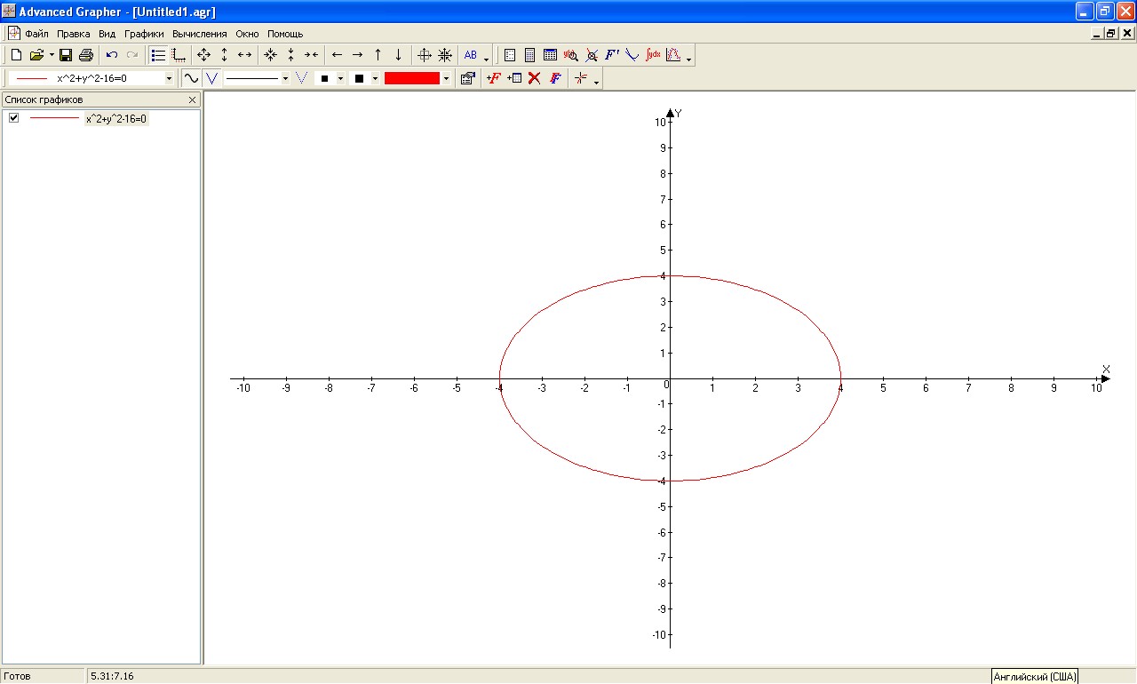 x^2+y^2=16 - это окружность с центром в начале координат и радиусом 4.