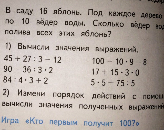 2)Измени порядок действий с помощью скобок и вычисли значения полученных выражений.