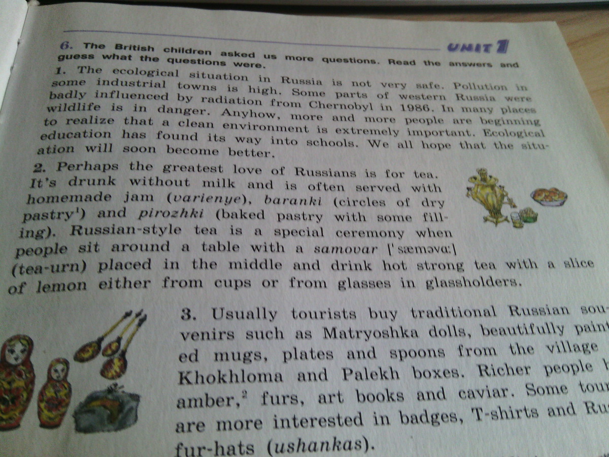 2 Возможно, россияне больше всего любят пить чай. Его пьют без молока и чай часто подается с домашним вареньем, баранками и пирожками (это выпечка с начинкой). Чай в русском стиле – это особая церемония, когда люди сидят за столом в середине которого стоит самовар, и пьют горячий крепкий чай с долькой лимона либо из чашек, либо из стеклянных стаканов в подстаканниках.