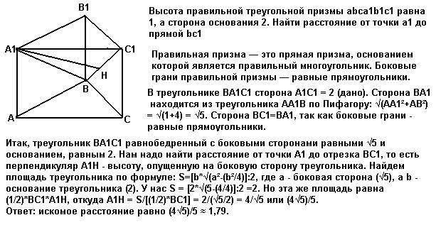 высота правильной треугольной призмы abca1b1c1 равна 1, а сторона основания 2. Найти расстояние от точки a1 до прямой bc1