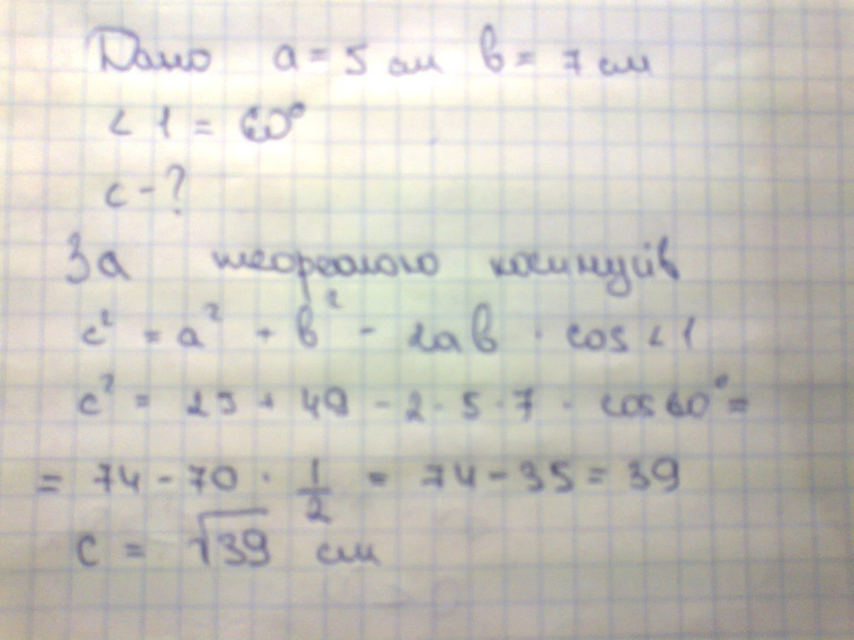 знайдіть невідому сторону трикутника,коли його дві сторони і кут між ними дорівнюють 5см,7см,60 градусів
