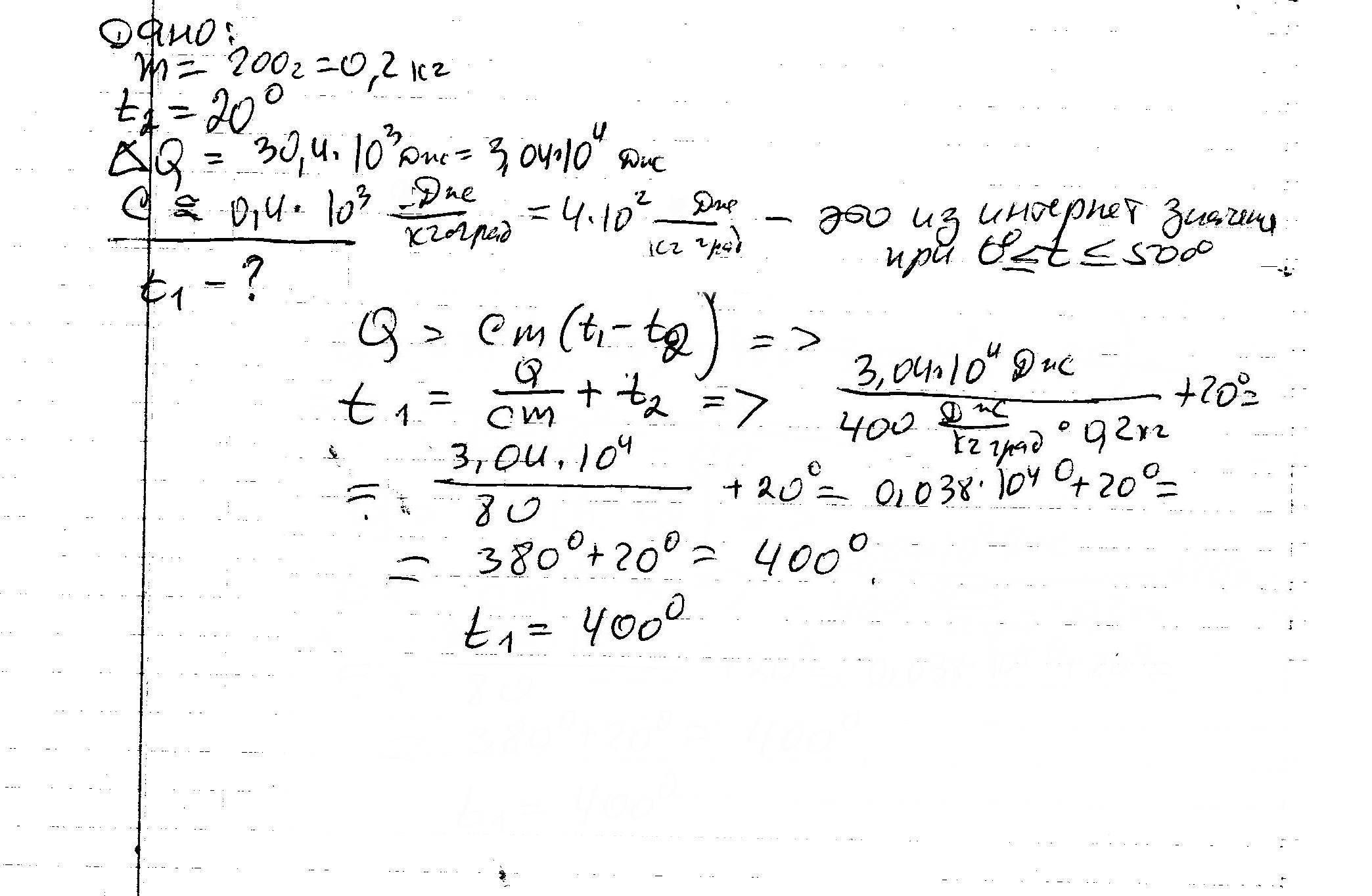 При охлаждении медного паяльника массой 200грамм до температуры 20 градусов выделилась энергия 30,4кДж Определите начальную температуру паяльника Помогите пожалуйста!