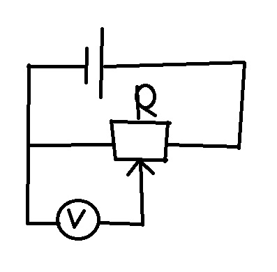 найти показание вольтметра (рис), если ЭДС источника равна 110В, сопротивление 4 кОм, а вольтметра 10 кОм. Движок поставлен посередине потенциометра. Внутренним сопротивлением источника пренебречь