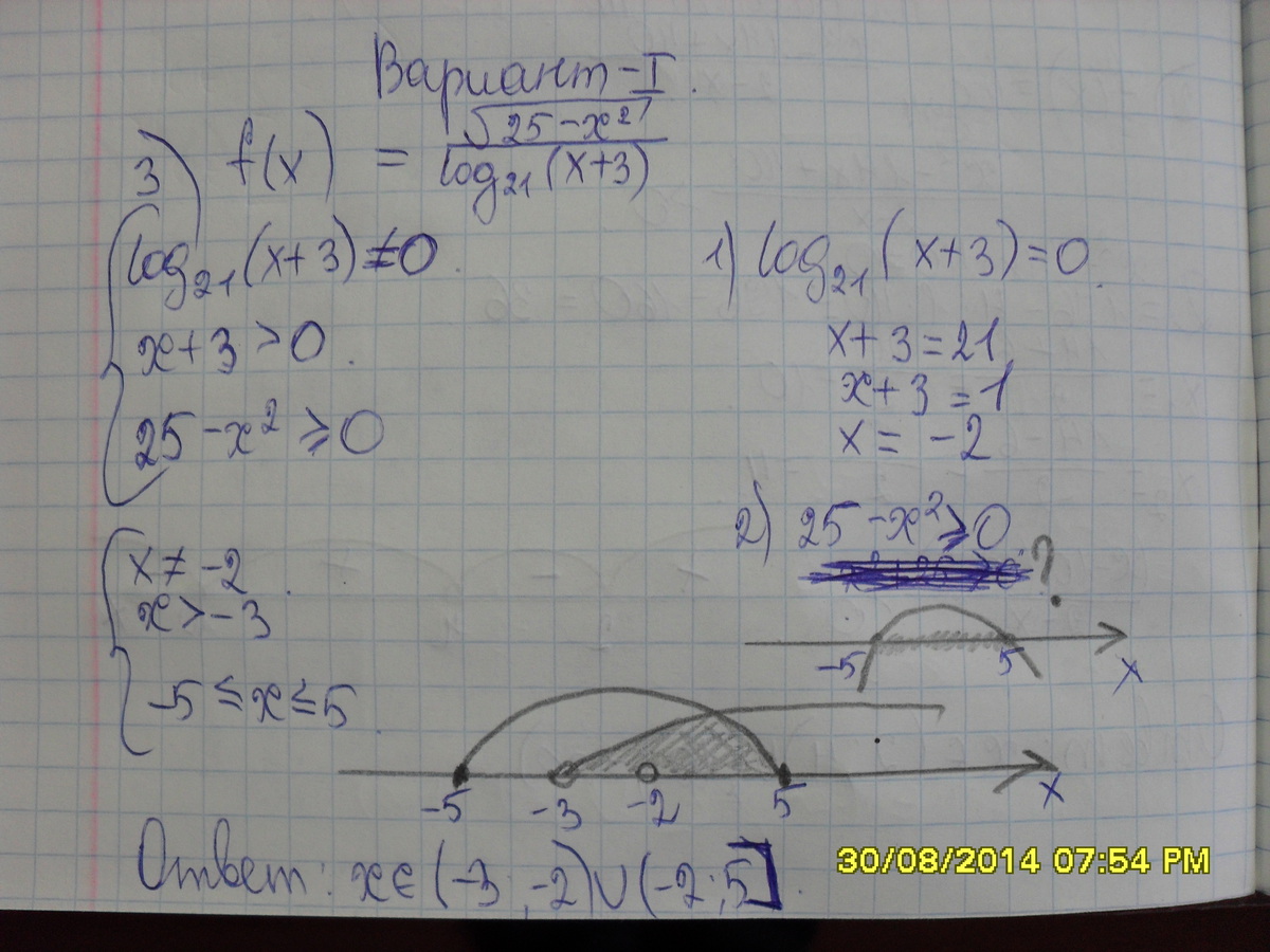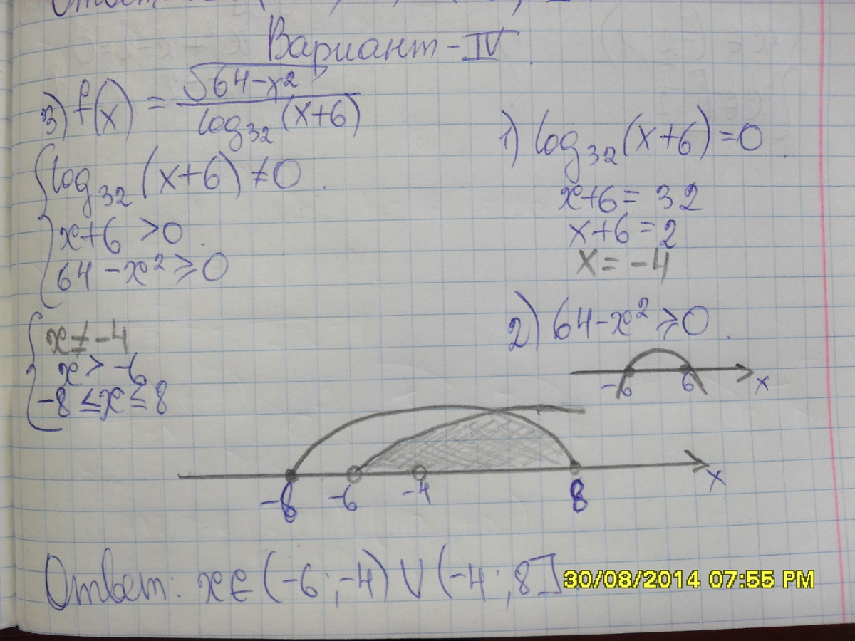![3)log_{32}(x+6)ne 0,; x+6ne 1,; xne -5\\64-x^2 geq 0,x^2-64 leq 0,; (x-8)(x+8) leq 0,; xin [-8,8]\\Otvet:; xin (-6,-5)U(-5,8] 3)log_{32}(x+6)ne 0,; x+6ne 1,; xne -5\\64-x^2 geq 0,x^2-64 leq 0,; (x-8)(x+8) leq 0,; xin [-8,8]\\Otvet:; xin (-6,-5)U(-5,8]](https://tex.z-dn.net/?f=3%29log_%7B32%7D%28x%2B6%29ne+0%2C%3B+x%2B6ne+1%2C%3B+xne+-5%5C%5C64-x%5E2+geq+0%2Cx%5E2-64+leq+0%2C%3B+%28x-8%29%28x%2B8%29+leq+0%2C%3B+xin+%5B-8%2C8%5D%5C%5COtvet%3A%3B+xin+%28-6%2C-5%29U%28-5%2C8%5D)