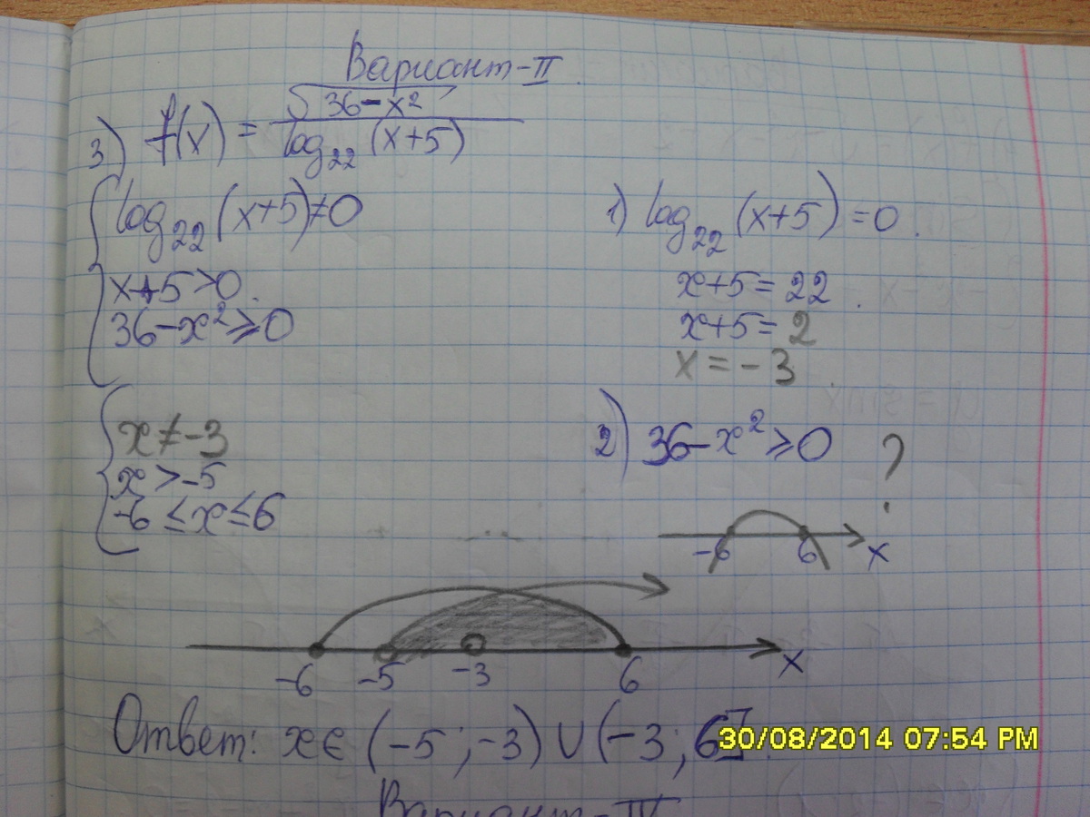 ![2); ; log_{22}(x+5)ne 0,; x+5ne 1,; xne -4; (!!!)\\36-x^2 geq 0; to x^2-36 leq 0,(x-6)(x+6) leq 0,; xin [-6,6]\\Otvet:; xin (-5,-4)U(-4,6] 2); ; log_{22}(x+5)ne 0,; x+5ne 1,; xne -4; (!!!)\\36-x^2 geq 0; to x^2-36 leq 0,(x-6)(x+6) leq 0,; xin [-6,6]\\Otvet:; xin (-5,-4)U(-4,6]](https://tex.z-dn.net/?f=2%29%3B+%3B+log_%7B22%7D%28x%2B5%29ne+0%2C%3B+x%2B5ne+1%2C%3B+xne+-4%3B+%28%21%21%21%29%5C%5C36-x%5E2+geq+0%3B+to+x%5E2-36+leq+0%2C%28x-6%29%28x%2B6%29+leq+0%2C%3B+xin+%5B-6%2C6%5D%5C%5COtvet%3A%3B+xin+%28-5%2C-4%29U%28-4%2C6%5D)