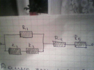 данна цепь постоянного тока со смешенным соединением сопротивлений. Определить Rэкв,ток и напряжение на каждом сопротивлении и их общие значения.