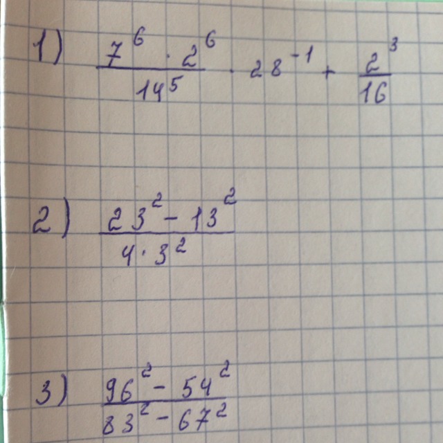 3) (96^2 - 54^2)/(83^2 - 67^2) = (96 - 54)(96 + 54)/(83 - 67)(83 + 67) = 42*150/16*150 = 42/16 = 21/8 = 2.625