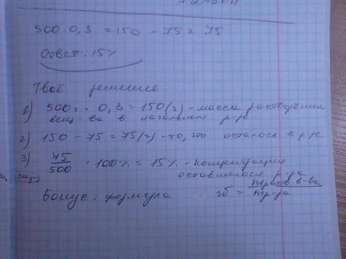 Из 500 г. 30 % раствора при охлаждении выделилось 75 г. растворенного вещества. Какова процентная концентрация оставшегося раствора?