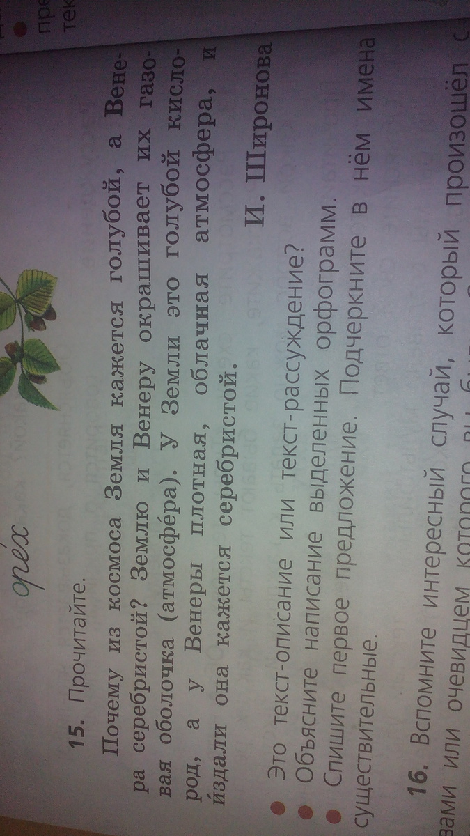 1)рассуждение. 2)Земля и Венера пишутся с большой буквы потому,что это названия планет,оболочка и облачная-чк и чн пишутся без мягкого знака,издали пишется с "а"(проверочное слово "даль"),серебристая(первая "е" не проверяется,это нужно запомнить!а вторая проверяется словом серебряный) 3)имена существительные: Земля и Венера