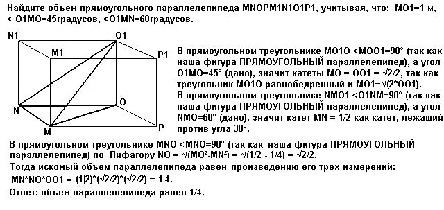 найдите объем прямоугольного параллелепипеда MNOPM1N1O1P1, учитывая, что:А) MO1=1 м, < О1МО=45градусов, <О1МN=60градусов