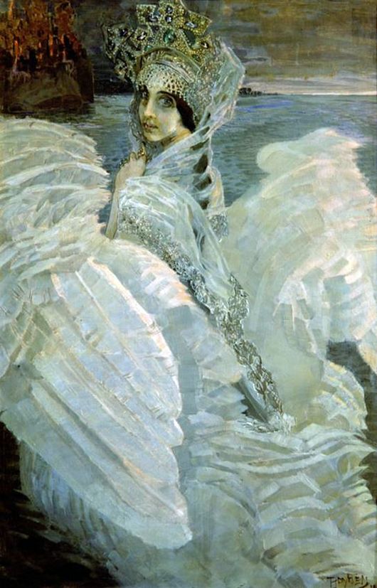 Эта картина в данное время размещена в Третьяковской галерее. Для ее написания был использован сценический образ героини оперы Римского-Корсакова «Сказка о царе Салтане» поставленная сюжету сказки Пушкина с одноименным названием. Врубель выполнил для премьеры оперы 1900 г. эскизы для декорации и костюмов, а партию Царевны-Лебеди спела жена художника.Самое яркое «театральное» творение Врубеля согласно мнению исследователей – это костюмы и декорации к постановке оперы «Сказка о царе Салтане» Римского-Корсакова, премьера сказки прошла в 1900 г. на сцене Частной оперы. Это помогло художнику стать более известным.Под впечатлением оперы он начинает писать картину «Царевна-Лебедь», которая явилась сценическим портретом Надежды Забелы-Врубель. Но полотно изображает не саму певицу, а загадочный образ Царевны, который был навеян ее лирическим и душевным пением.Как вспоминают современники, и голос и внешний вид певицы подходили под те сказочные и фантастические образы, которые она должна была воплощать на сцене: ее голос нельзя было ни с чем сравнить, он был ровный, легкий, нежный и наполненный красками или, сменяющимися переливами какой-то из красок, он был очень выразительным, и вместе с тем спокойным.. А ее облик заставлял только восхищаться! Ее широко расставленные глаза, пленительная и в то же время наивная улыбка, тонкое и изящное тело.Картина была написана художником на хуторе Ге около станции Плиски в Черниговской губернии в лето 1900. Врубель изобразил жену на фоне созданных им декораций к «Сказке о царе Салтане», в костюме, который он сам сочинил для спектакля. Но сценический образ в картине стал сказочным.В момент, когда лебедь перевоплощается в нежную и таинственную красавицу-царевну время словно застыло, а свет заката преобразил реальность, и она стала зыбкая и многозначительная. А большие глаза Царевны-Лебедя сверкают как драгоценные камни кокошника, обилие и тяжесть которых делают лишь более выразительным ее хрупкий образ.У Врубеля был редкий дар видеть музыку цвета. Как говорила его жена, перламутровые оттенки, колорит которых был использован в «Царевне-Лебеде» и других картинах художника, Врубель смог найти в теме мор в музыке Римского-Корсакова.