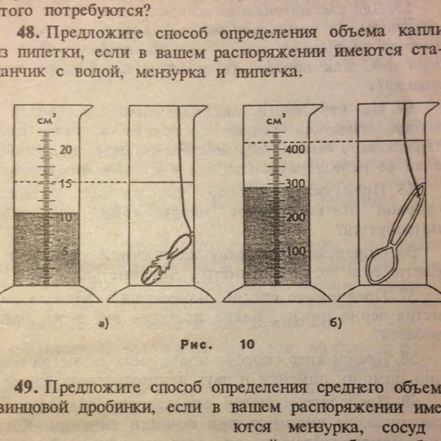 Определите объем тел ,помещенных в мензурки. Рис.10