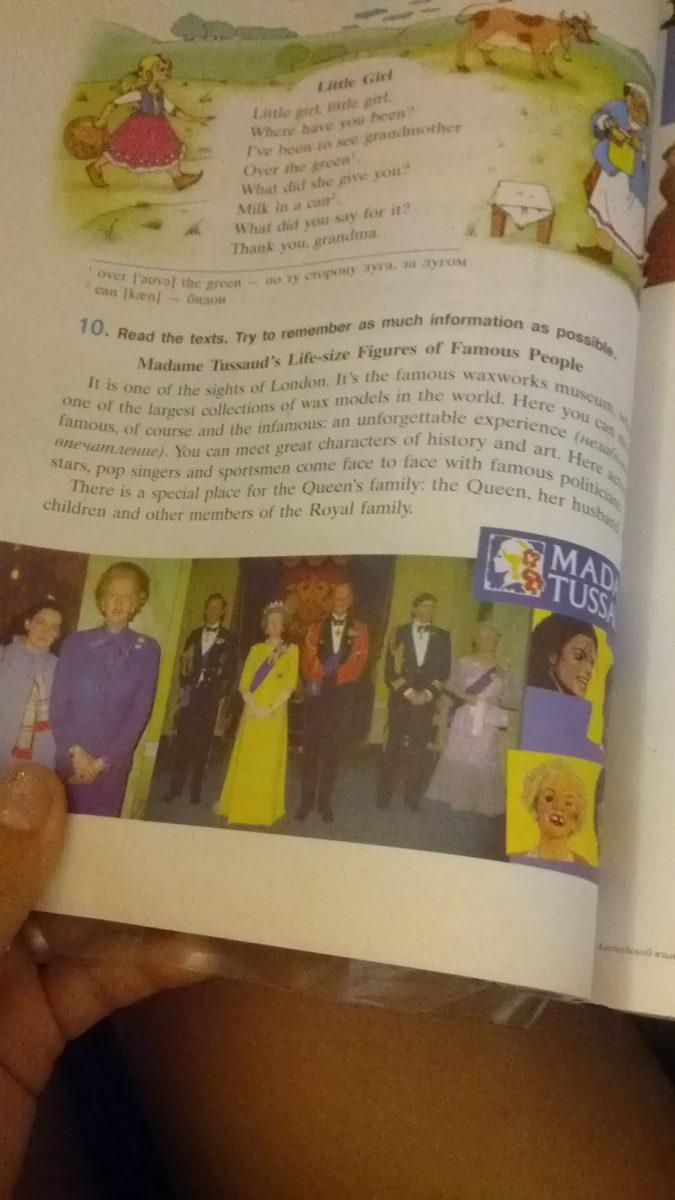 Одна из достопримечательностей Лондона. Это знаменитый музей восковых работ, где находится одна из огромнейших коллекций восковых моделей в мире. Здесь, ты можешь найти знаменитых и знаменитых дурной славой : (дальше есть перевод в учебнике). Ты можешь встретить замечательных персонажей истории и искусства (арта). Здесь (есть-находятся) актеры, звезды, поп певцы и спортсмены, встреться лицом к лицу с популярными политиками.