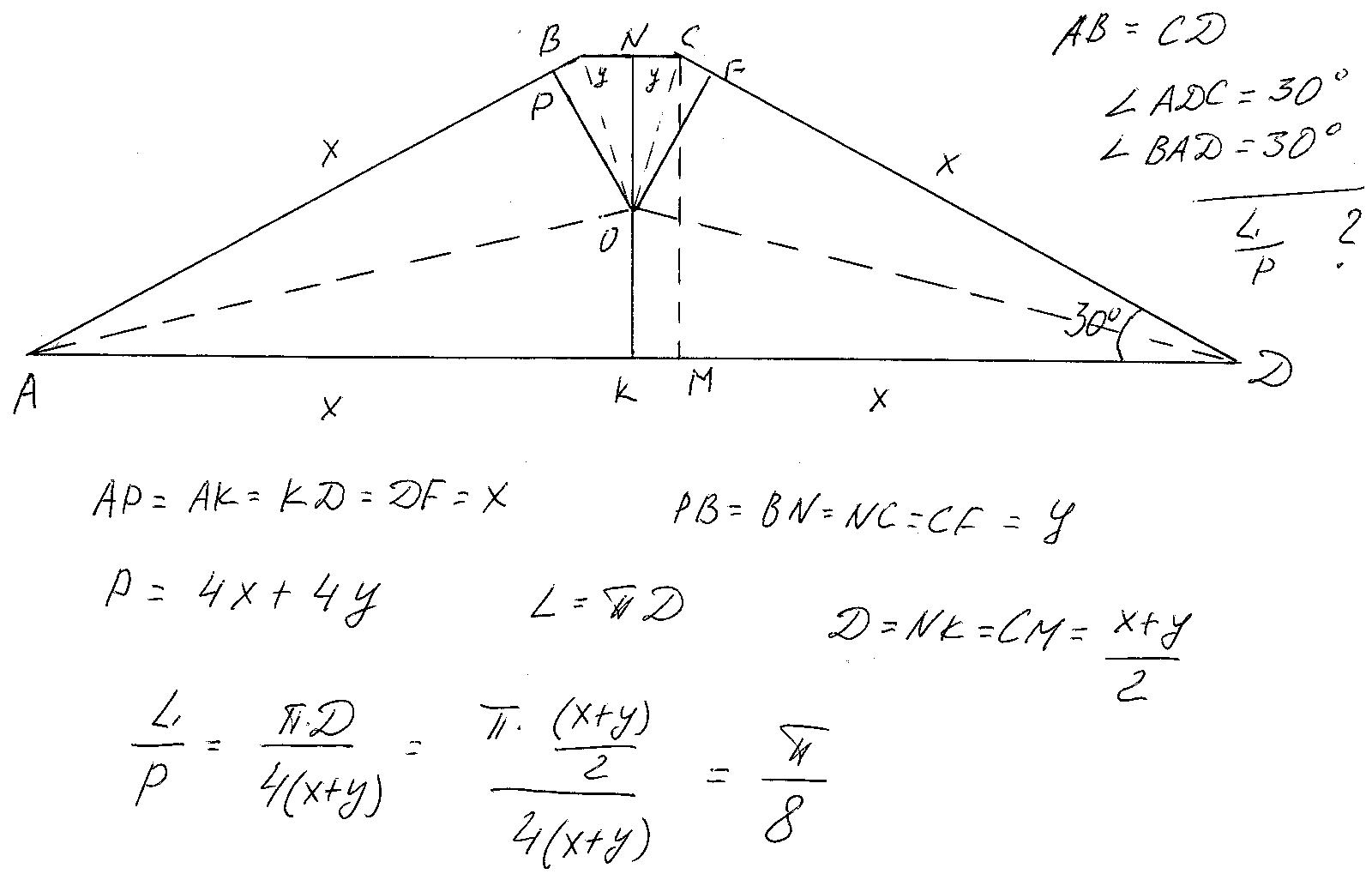 Обозначим трапецию АВСД(смотри рисунок).Проведём радиусы ОР, ОF, ОК. Диаметр вписанной окружности равен высоте трапеции NК=СМ=1/2 СД. Поскольку в прямоугольном треугольнике СМД сторона СМ лежит против угла 30 градусов.Далее рассмотрим треугольники АВО и АОК они равны как прямоугольные у которых гипотенуза АО -общая и катеты равны как радиусы. Аналогично доказываем и для остальных треугольников. Обозначаем равные стороны Х и У. И находим отношение L/Р="пи"/8.