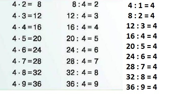 Запиши в первый столбик все табличные случаи умножения числа 4. Во второй - табличные случаи деления,в которых делитель равен 4.В третий табличные случаи деления, в которых значение частного равно 4.