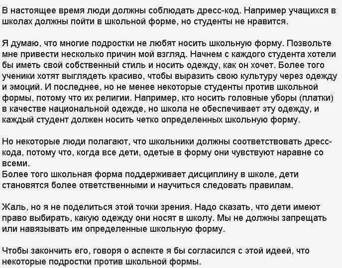 But some people believe, that school children must wear dress code, because when all kids are dressed in uniforms they feel equal. School uniform maintains discipline in a school, children become more responsible and learn the rules.