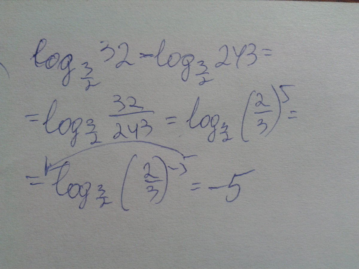 log(3/2)32-log(3/2)243=log(3/2)(32/243)=log(3/2)(2/3)^5=-5