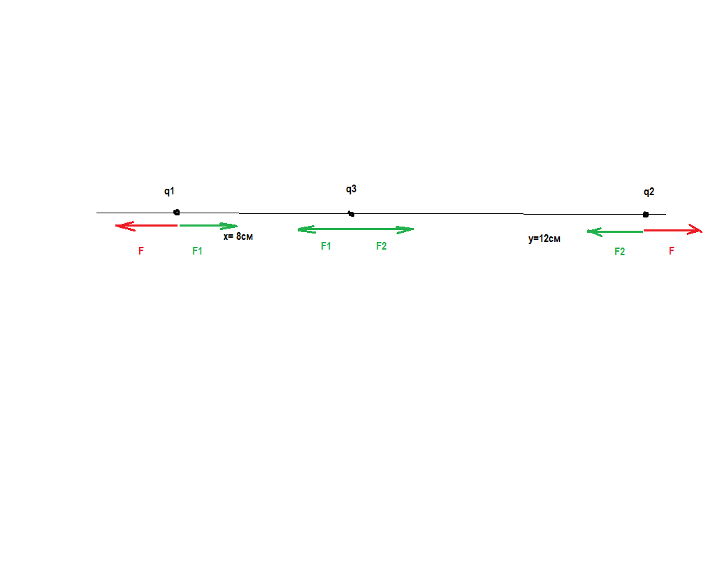 Два положительно заряженных тела, заряды которых 1,67 и 3,33 нКл, закреплены на расстоянии 20 см друг от друга. В какой точке на прямой, соединяющей эти тела, необходимо разместить третье тело с зарядом -0,67 нКл, чтобы образовавшаяся система была в равновесии? Массами тел пренебречь.