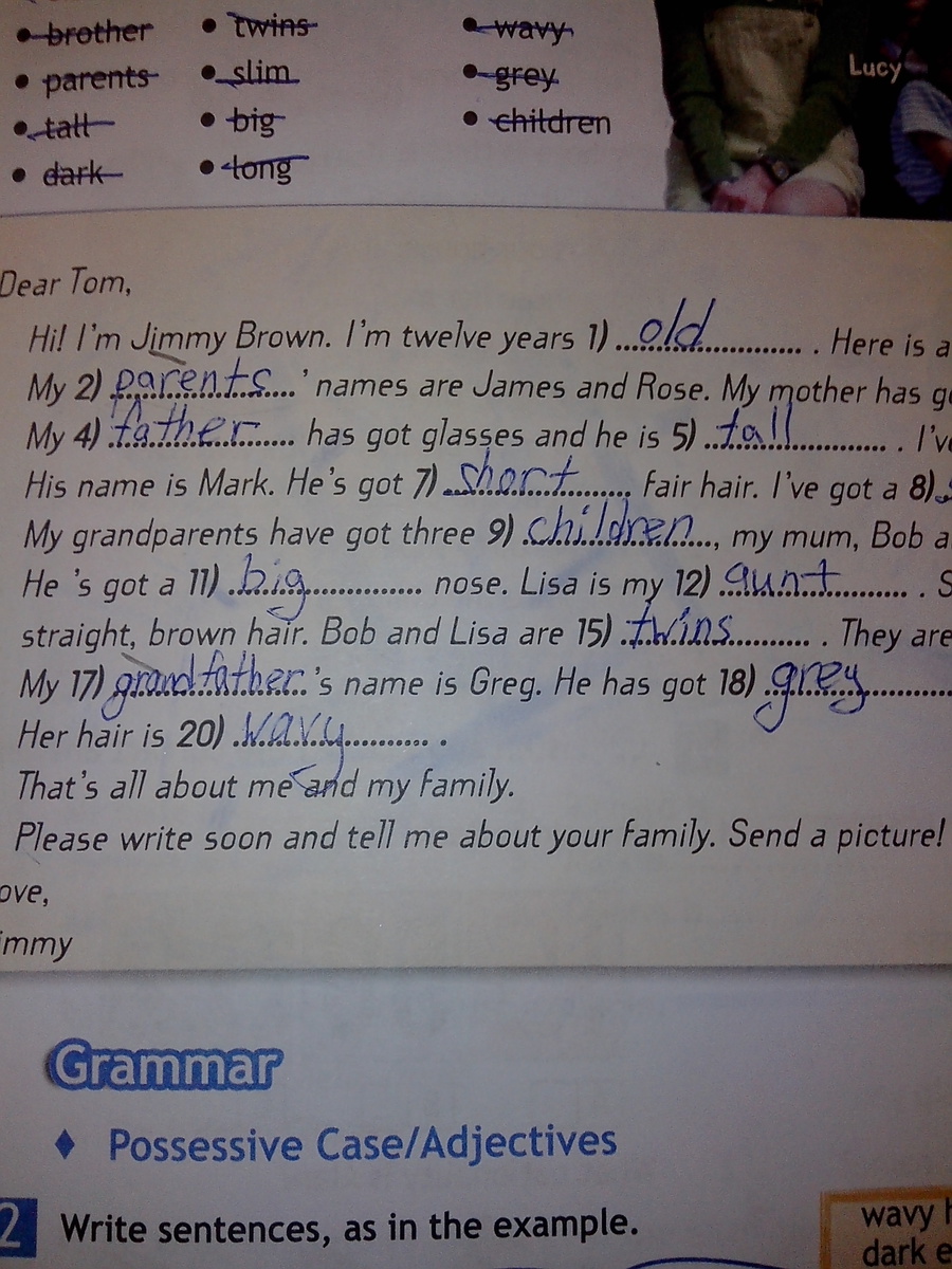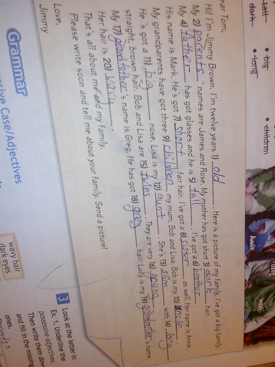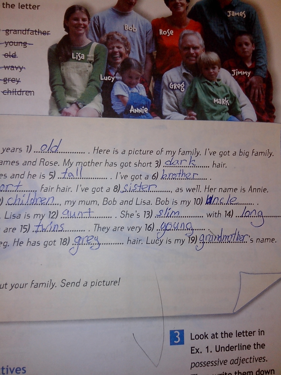 Look at the letter in Ex.1(фото прилагается).Underline the possessive adjectives. Then write them down and fill in the missing ones.