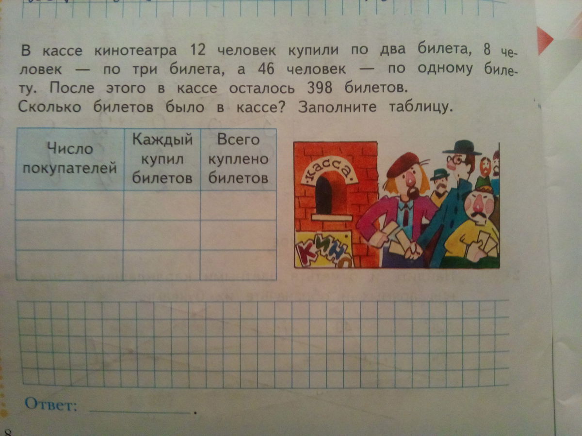 в кассе кинотеатра 12 человек купили по два билета,8 человек - по 3 билета , а 46 человек - по 1 билету. После этого в кассе осталось 398 билетов.