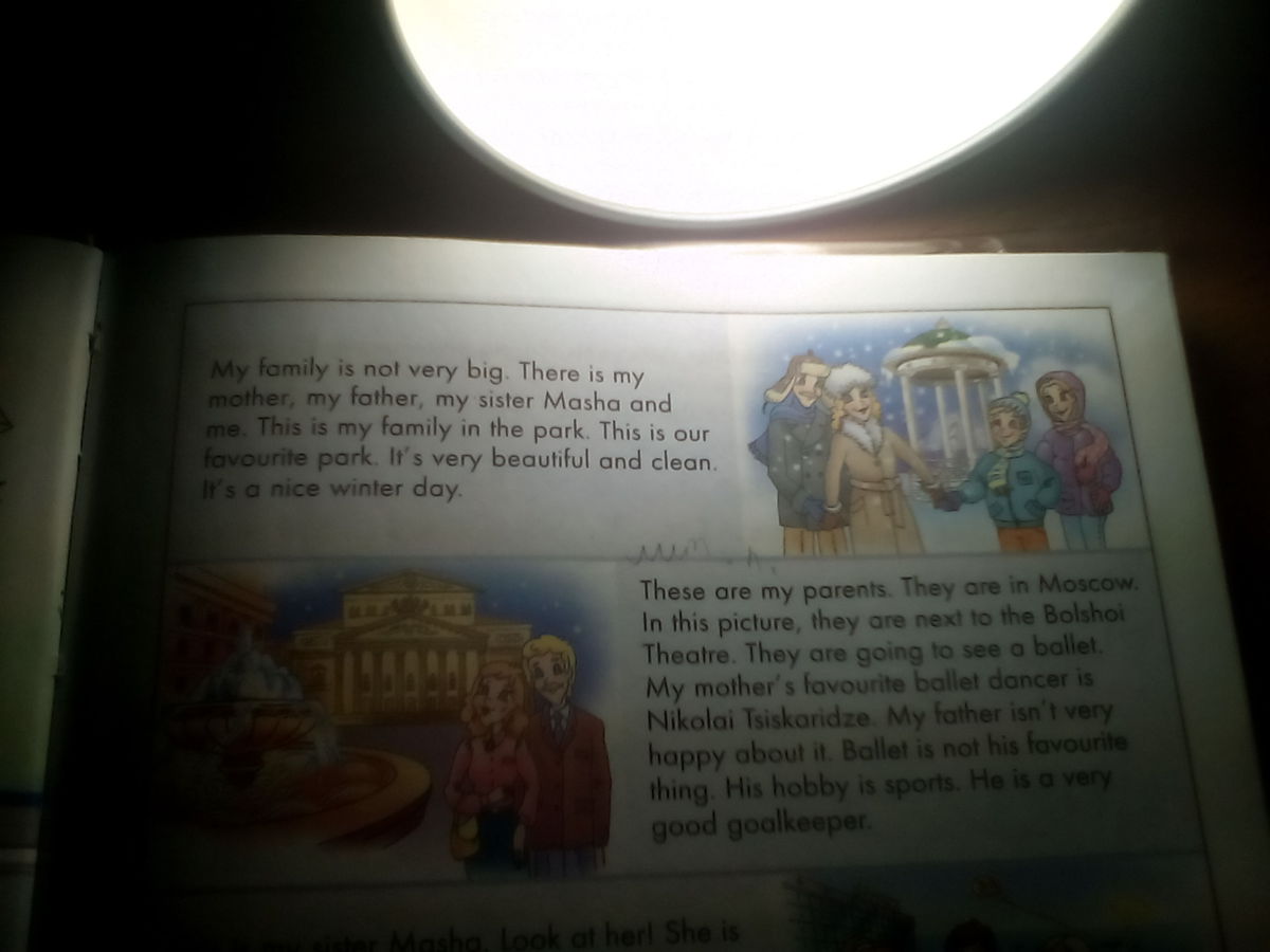 3.Это мои родители. Они в Москве. На этой фотографии они напротив Большого Театра. Они будут смотреть балет. Любимый балерун моей мамы - это Николай Тситскаридзе. Мой отец не очень этому рад. Он не очень любит балет. Его хобби - это спорт и он хороший вратарь.
