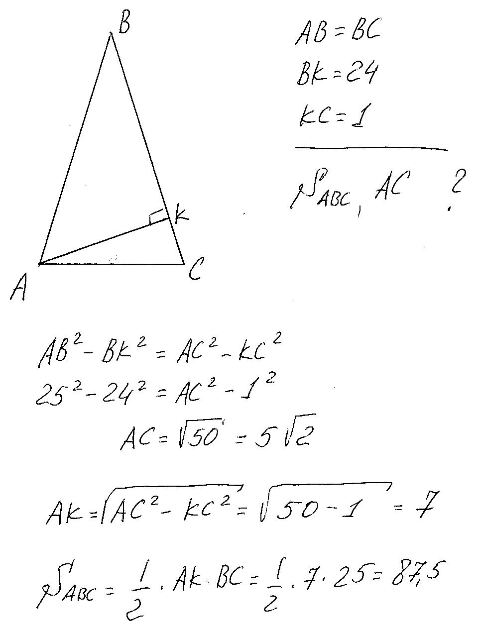 В треугольнике ABC AB=BC. Высота AK делит сторону BC на отрезки BK=24 см и KC=1 см. Найдите площадь треугольника и сторону AC.