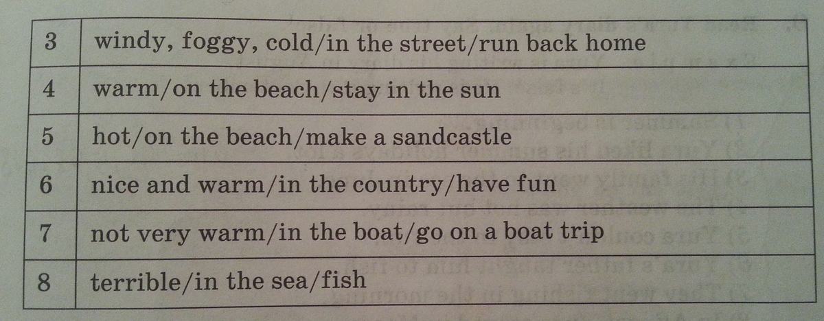 4.the weather is warm.i go on the beach.i stay in the sun.