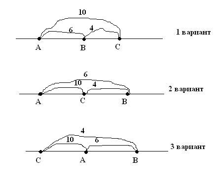 точки A,B,C лежат на одной прямой .Известно ,что AB=6 см,AC=10см,BC=4см.1)может ли точка C лежать между точками А и B.2)Может ли точка B лежать между A точками и C ?3)какая из этих трёх точек лежит между двумя другими ?