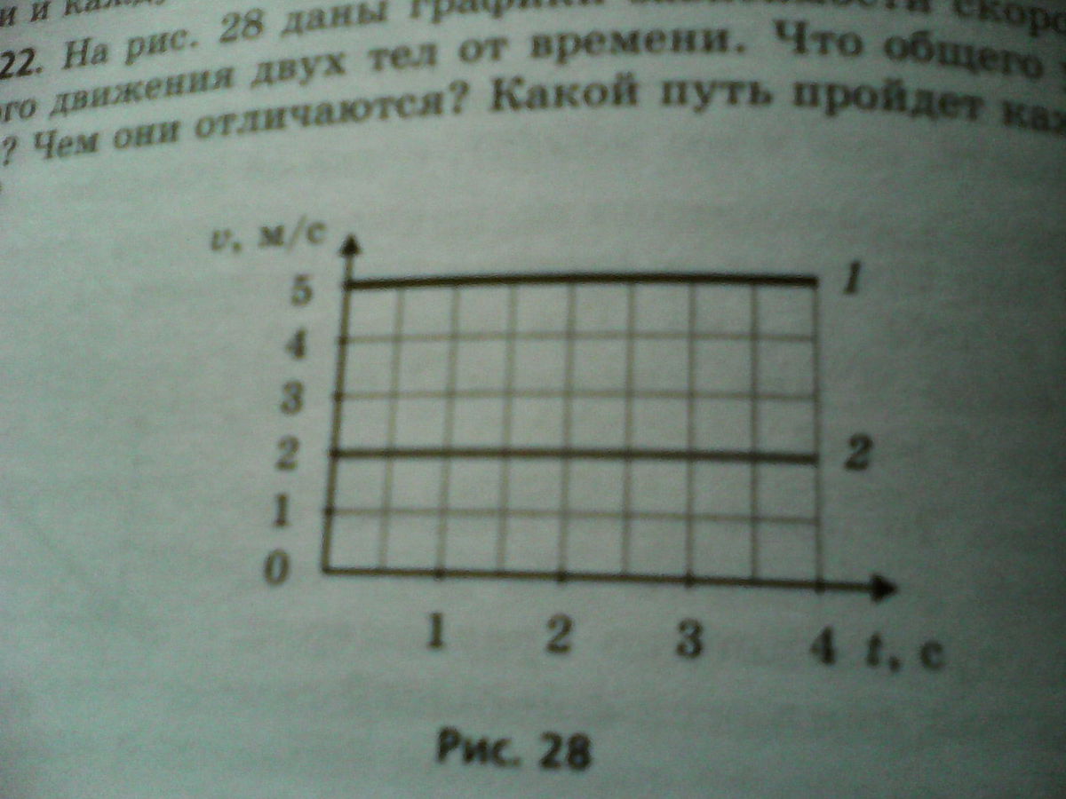 Даны графики зависимости скорости равномерного движения двух тел от времени. Что общего у этих графиков? Чем они отличаются?