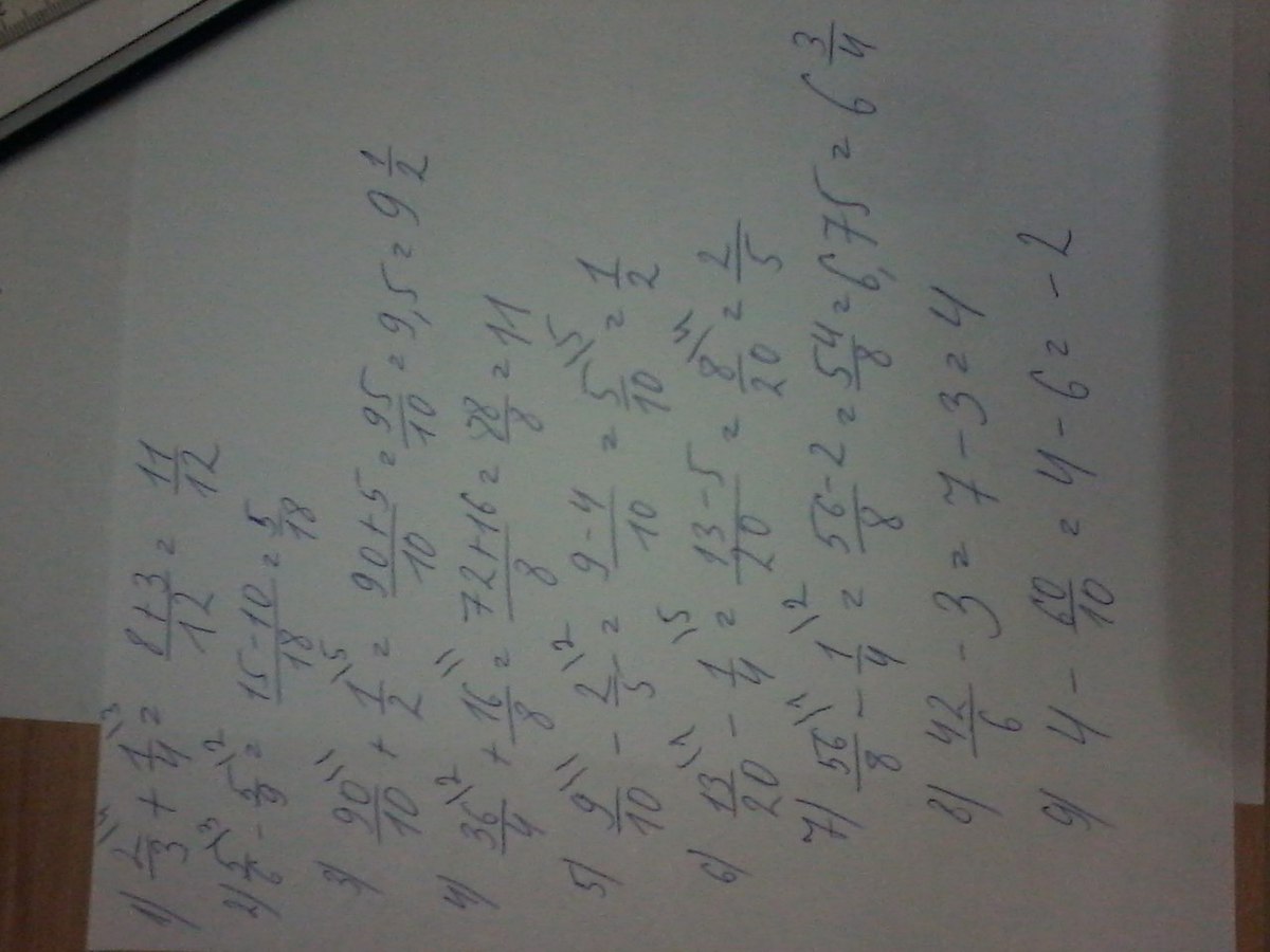 2/3+1/4= , 5/6-5/9= , 90/10+1/2= , 36/4+16/8= , 9/10-2/5= ,13/20-1/4= , 56/8-1/4= , 42/6-3= , 4-60/10= . плиз помогите срочно.