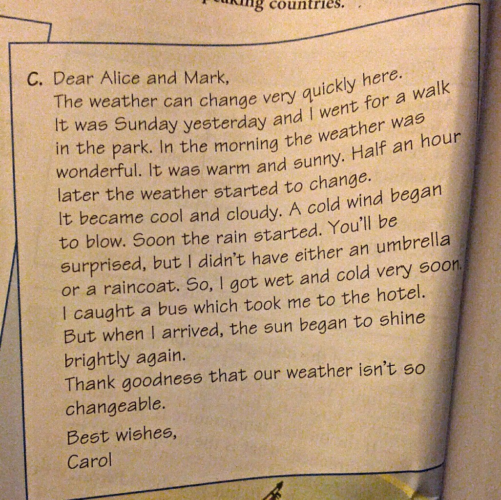 утром погода была прекрасна. было тепло и солнечно. через пол часа погода изменилась. стало прохладно. начался дождь. то сюрприз для вас