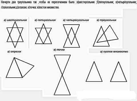 начерти два треуголька так, чтобы их пересечением были: а) шестиугольник, б) пятиугольник, в) четырехугольник, г) треугольник, д) отрезок, е) точка, ж) пустое множество