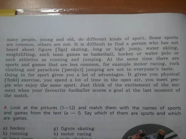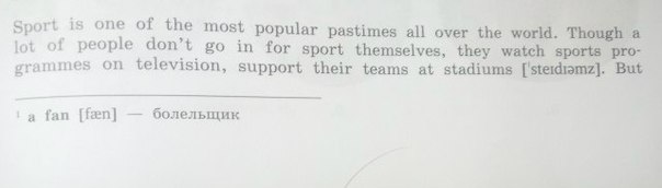 Спорт один из самых популярных занятий в мире.Большенство людей не занимается спортом,они смотрят спорт. програмы,спорт.команды на стадионе. ну я не знаю переаела,как смогла отдельные слова лучше проверить это первая часть только.