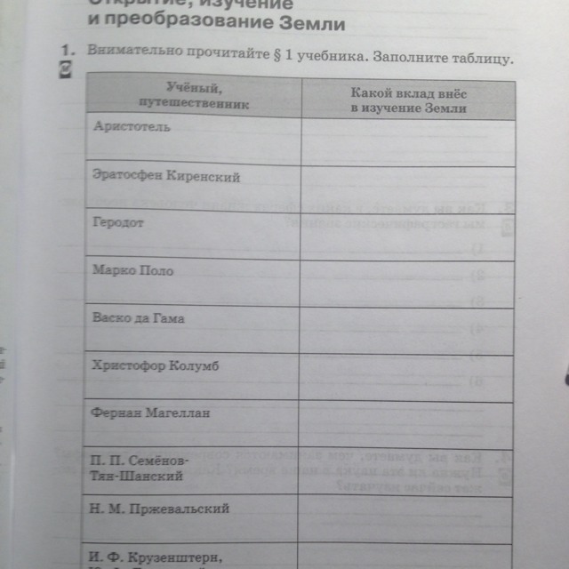 Аристотель - выдвинул предположение о шарообразности Земли. Эратосфен - первый употребил термин "географика", достаточно точно расчитал размеры Земли. Геродот - первый побывал в Скифии, описал быт скифов. Марко Поло - путешествовал по Китаю (около 20 лет),свои наблюдения изложил в книге "Разнообразие стран". Васко да Гама - открыл морской путь в Индию. Христофор Колумб - оправился из Испании (г.Палос) на запад к берегам Индии, но достиг островов расположенных в Атлантическом океане между Северной и Южной Америкой (в память о его открытии острова носят название Вест - Индия). Фернанд Магеллан - совершил первое кругосветное путешествие, открыл пролив между материком Южная Америкая и о.Огненная Земля и Тихий океан. И.Ф.Крузенштерн - мореплаватель, руководитель экспедиции во время которой была уточнена карта мира и открыты ряд островов (1803-1806 гг.). Н.М. Пржевальский - проводил исследования в степях Азии (лошадь Пржевальского).